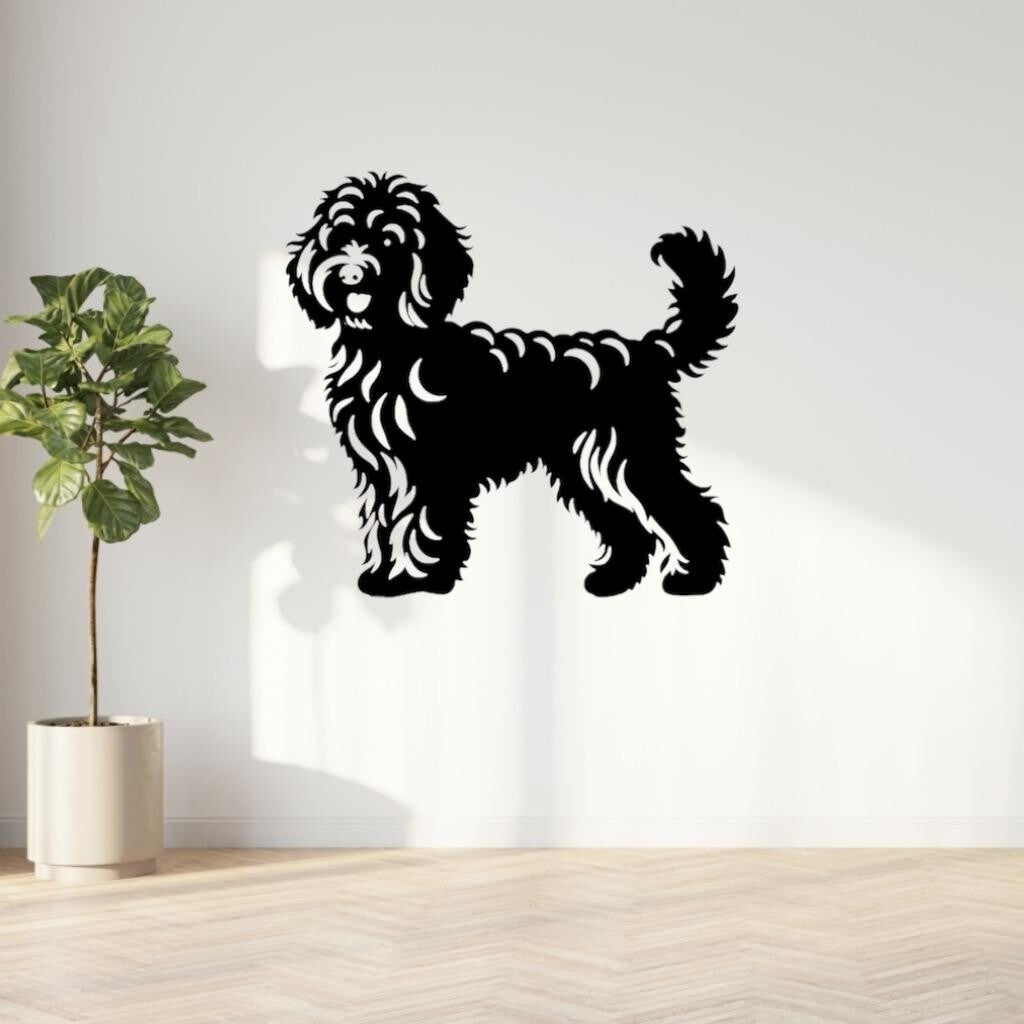 Geef je interieur een warme, natuurlijke look met deze prachtige houten wanddecoratie van een Labradoodle.