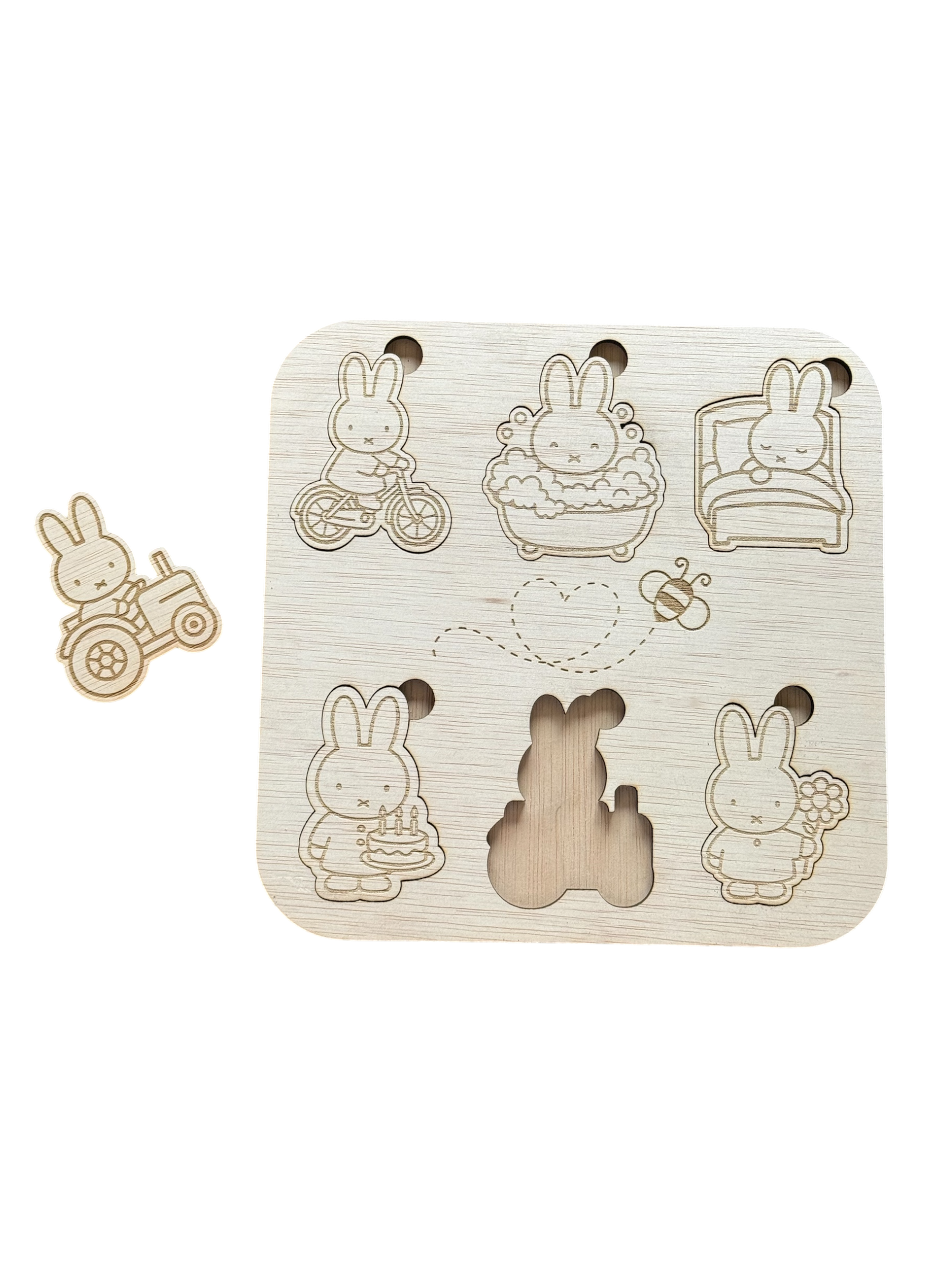 Schattige houten puzzel van Nijntje, perfect voor kleine kinderhandjes! Deze duurzame puzzel is gemaakt van hoogwaardig hout en is voorzien van openingen waardoor de puzzelstukjes makkelijk vast te pakken zijn.